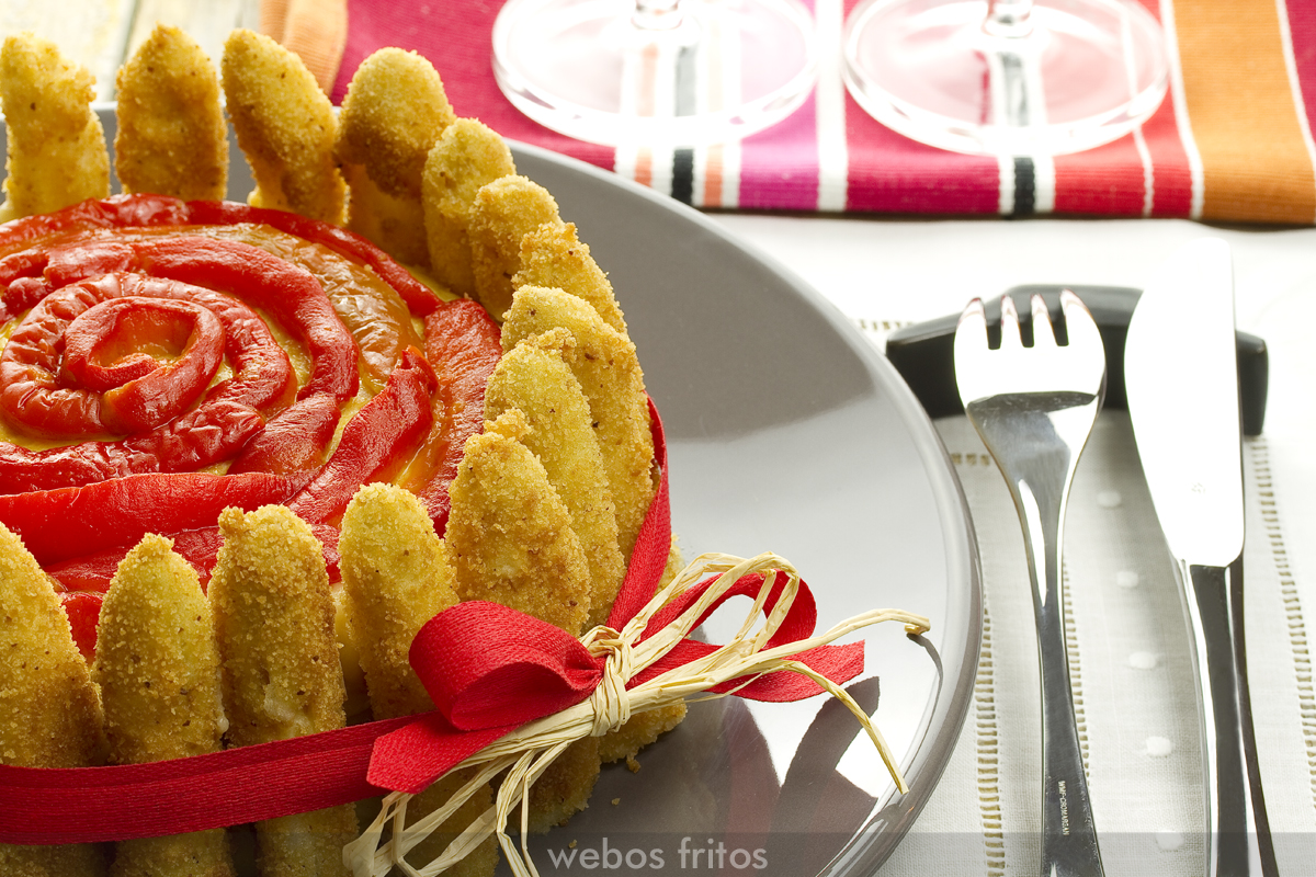 Ya puestos a presentar mi colección verano 2010 de pasteles de tortilla, va uno con la presentación en forma de charlota que me parece tan atractiva, un poco en la línea del último pastel, pero rodeando las tortillas, esta vez de cebolla y de gambas, con una delicatessen, unos espárragos blancos de Navarra rebozados.
