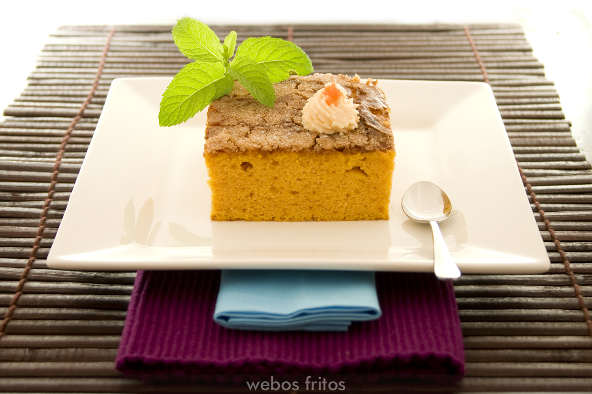Hasta hace poco la calabaza era una gran desconocida en mi cocina. Por mi zona sólo se ve en las fruterías esporádicamente, y no hay demasiada cultura de la calabaza. Hoy le pongo solución con esta receta de coca de calabaza.A pesar de esto tengo un proveedor de fábula, que es el padre de mi amiga y vecina Pecas, que tiene un huerto en Valdeconcha, un pueblo de Guadalajara, y del cual me surte en muchas ocasiones. Esta vez me trajo media calabaza hermosísima, que debía pesar casi un kilo, y que supo, desde que entró en mi casa, el poco tiempo que le quedaba a la pobre en este mundo…El resultado es fantástico. Queda un bizcocho sabroso y muy, muy jugoso. Quedó un trocito para el día siguiente y, la verdad, estaba casi mejor que reciente, cosa que en un bizcocho es muy de agradecer.El adorno está hecho con puré de calabaza asada, nata montada y azúcar glas. El trozo de la foto fue tachado de excesivamente minimalista por mis carpantillas, que me pidieron que mandara a tomar viento el minimalismo, y que pusiera una capa generosa por encima en los que nos íbamos a comer, así que, cual sueño de cualquier amante de manga pastelera, me lié a poner moñitos, y disfrutamos todos muchísimo.