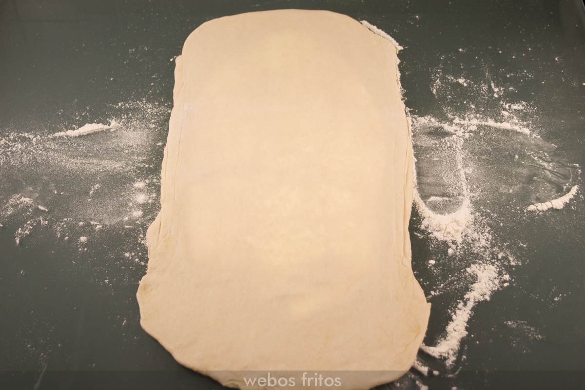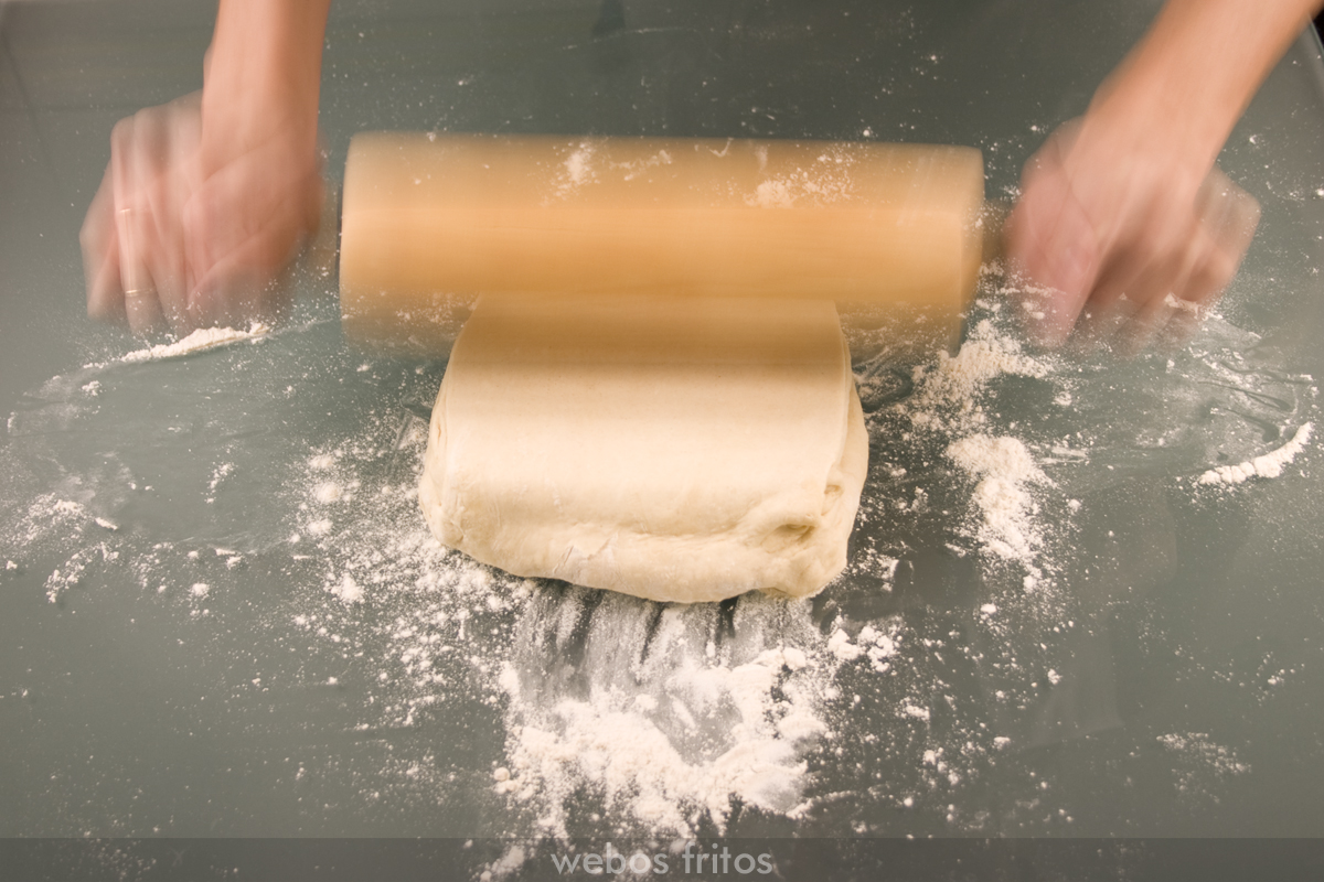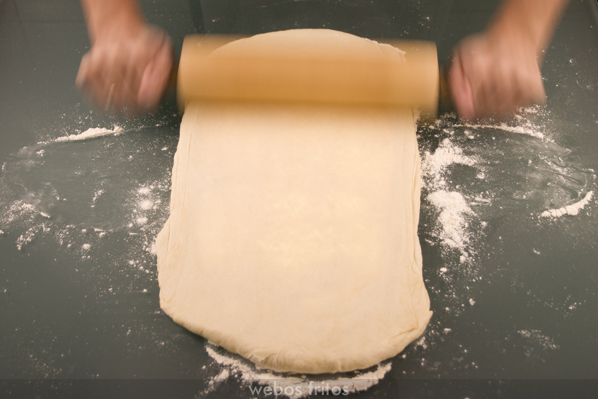 Con el rodillo extenderemos la masa de hojaldre de manera uniforme hasta conseguir una plancha rectangular como las que nos venden.