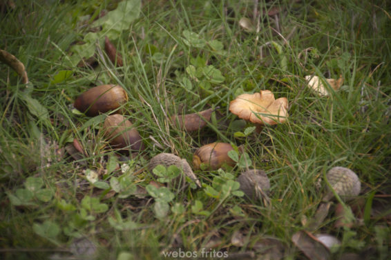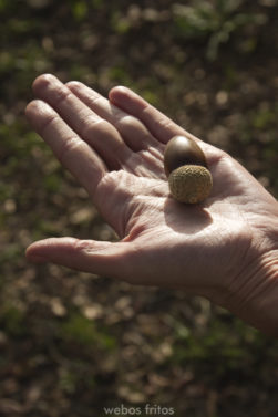 La encina, el alcornoque, el quejigo y el roble. Las primeras son las más queridas por los cerdos, porque su fruto es el más dulce de todos. La dehesa tiene un manto de hierbas frescas que protegen al fruto del barro y evitan su deterioro. El tamaño de la bellota es muy respetable, así que no me extraña que los cerdos se pirrien por ellas.
