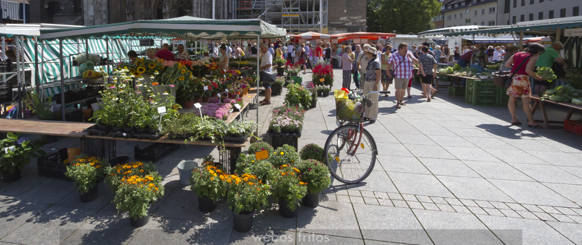 Yo tenía noticias del fabuloso mercado que se establece a los pies de su fachada, y mi fotógrafo quería cotillear la Stadthaus, obra de Richard Meier, que se levanta también a sus pies, cerrando el lado sur de la Münsterplatz. Total, que para allá fuimos a conocer la ciudad.