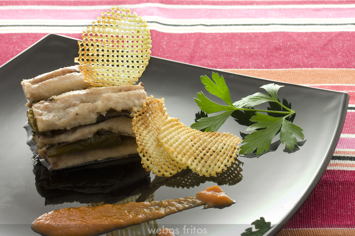 Acompañamos este milhojas de unos pimientos verdes recién fritos y muy escurridos y con una salsa que a mí me apasiona, que me la enseñó mi madre y que acompaña muchos de nuestros platos.