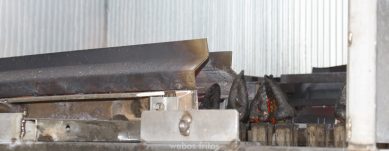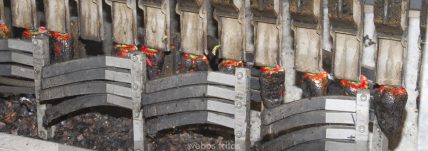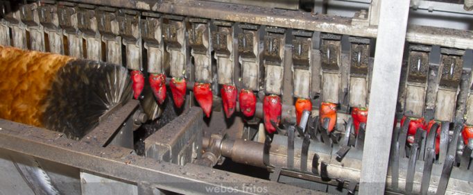 • La propia cinta lleva a los pimientos a la parte inferior del horno donde una máquina palmea con cuidado los pimientos para quitar una primera capa de la piel, la más quemada, y por unos cepillos que eliminan lo máximo de la piel que se puede sin dañar el pimiento.