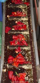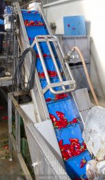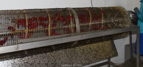 • El paso siguiente es una cinta en la que uno a uno es limpiado de restos de piel y de semillas, con especial meticulosidad para que no se rompan y vayan bien limpios. El responsable de la fábrica, de la que luego te hablaré, insistió mucho en que no se sumergen ni en agua ni en ninguna solución química, y es que este es un requisito de la D.O.