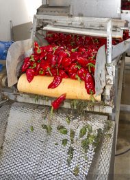 • El pimiento pasa a una segunda cadena en la que se le hace pasar a través de un cedazo cilíndrico que elimina en gran medida las semillas.