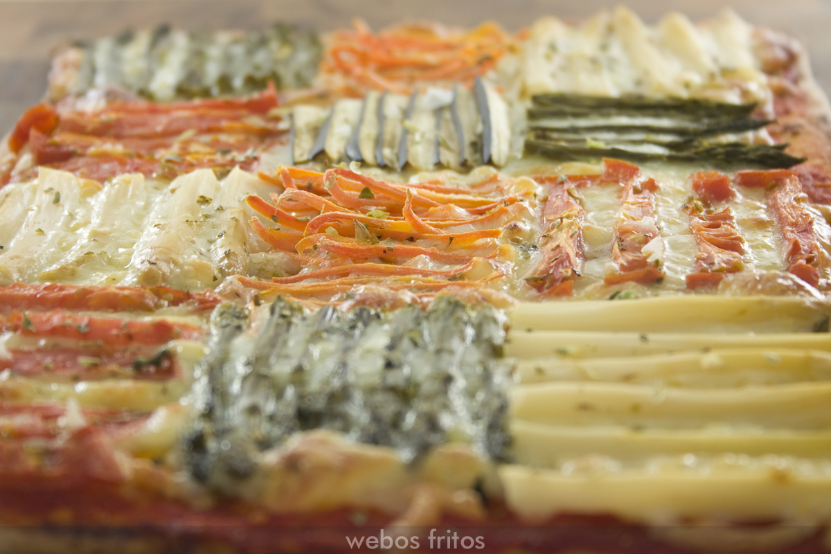 Para este paso es imprescindible trabajar con rapidez, para que la masa no pierda mucho calor. Colocar una capa de mozarella, y a continuación, las verduras como os guste, formando cuadrados alineándolas en direcciones contrapuestas, y combinando colores. Admite todo. Lo que se quiera. Innovad.
