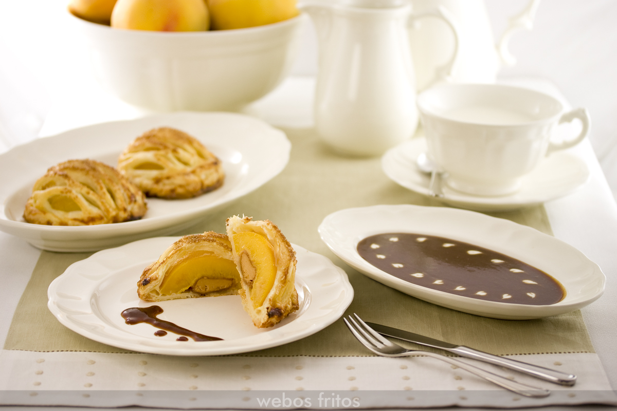 Estas rejillas de melocotón con salsa de caramelo lo tienen todo a mi parecer: es muy rico, su presentación es ideal para una ocasión en que tengamos invitados, y es de muy fácil realización. Quizá lo que más fácil puede parecer, que es la salsa de caramelo, para mí es lo más dificil de lograr, para que tenga ese punto justo en el que el sabor del caramelo sea perfecto y no amargue.Os animo a hacer una vez vuestro propio hojaldre, ahora que han pasado los calores del verano. Es una cosa que todos deberíamos probar por lo menos una vez en la vida, un postre o un plato salado con hojaldre casero. Está claro, y lo pueden decir todos los amigos que se han animado a hacerlo, que hay un antes y un después de este momento, y si no os apetece o no tenéis tiempo, os aconsejo el del Lidl que tiene una muy equilibrada relación calidad-precio.Este postre está inspirado en una receta de la Gran enciclopedia de la fruta de Kate Whiteman y Maggie Mayhew, de la editorial Hymsa, libro que os aconsejo porque es una maravilla.A ello.
