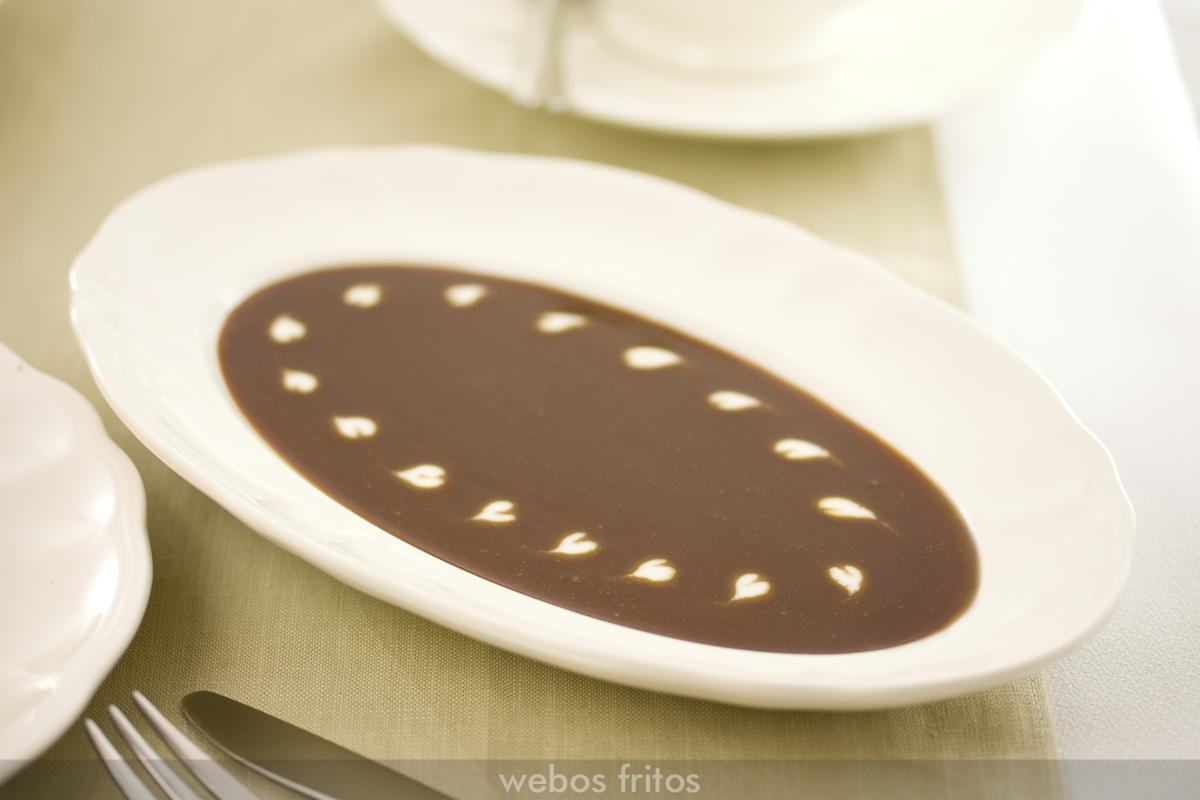Para formar un dibujo, podéis optar por la solución que utilizo yo en las cremas, o la que he usado hoy, y que podéis ver en la foto. Basta con echar con una jeringuilla unas gotas de nata —para cocinar , no para montar— sobre las salsa, a intervalos regulares.