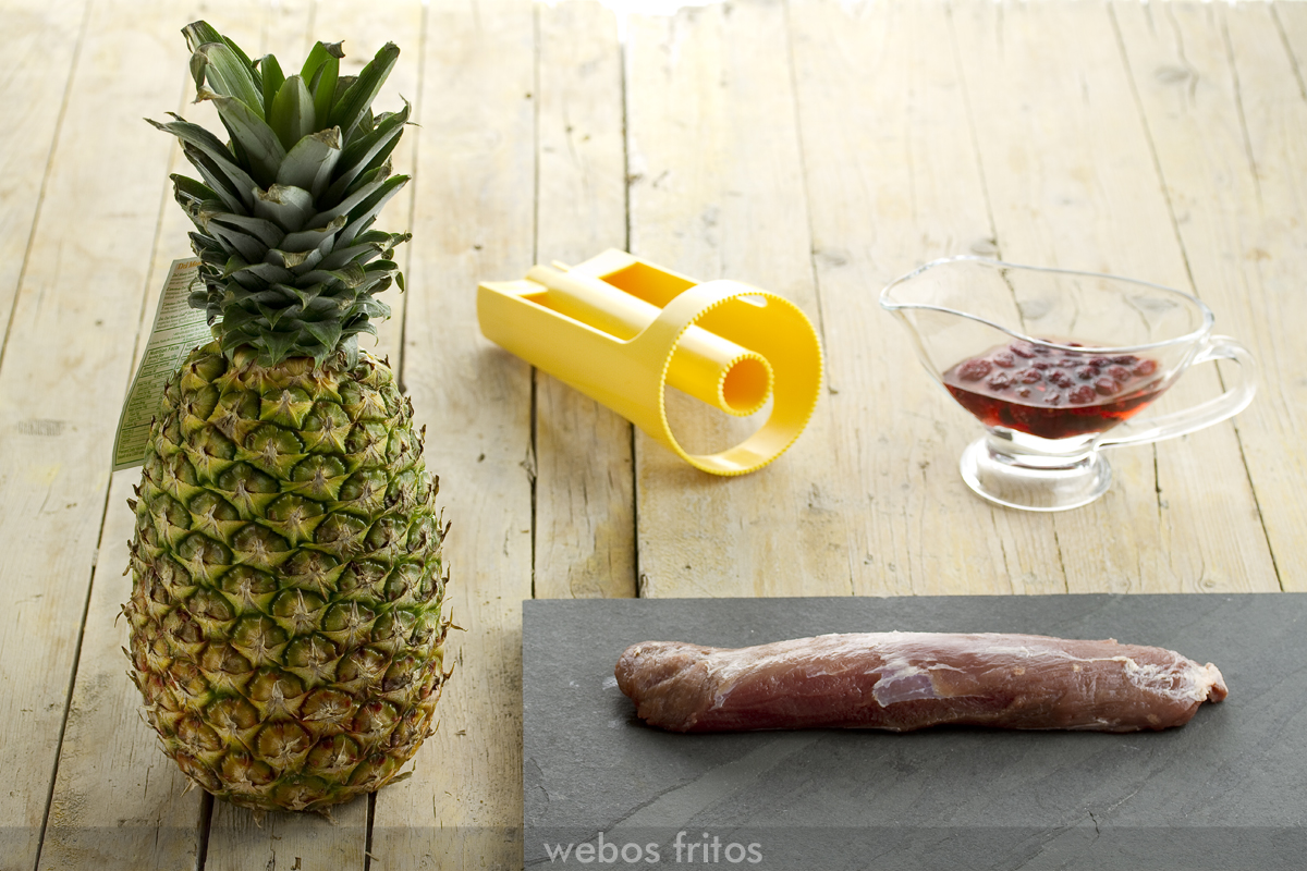 Me gusta mucho más utilizar piña natural; me parece que la que está en almíbar no le aporta a este plato el punto entre ácido y dulce que tiene una buena piña natural. Le puse al solomillo un corazón de arándanos deshidratados que compré en Mercadona, para que le aportara vistosidad y ese punto de sabor tan peculiar. Por lo demás, vais a ver que se puede hacer con anterioridad, y que es de las recetas más fáciles de trabajar. Sólo encuentro un poco de dificultad en quitar el corazón y la corteza a la piña con el aparato que utilizamos en casa y con el que hay que hacer bastante fuerza, ya que la carne de la piña es apretada y tersa. Yo tengo la suerte de que mi fotógrafo se encarga de este menester, y a mí ya me da la pieza de piña tal y como la veis en la foto. Este maquinillo es fácil de encontrar, se encuentra en un montón de sitios donde venden cacharros de cocina, y es muy económico. La verdad es que la piña queda con un aspecto impecable, que no podríamos conseguir a mano.