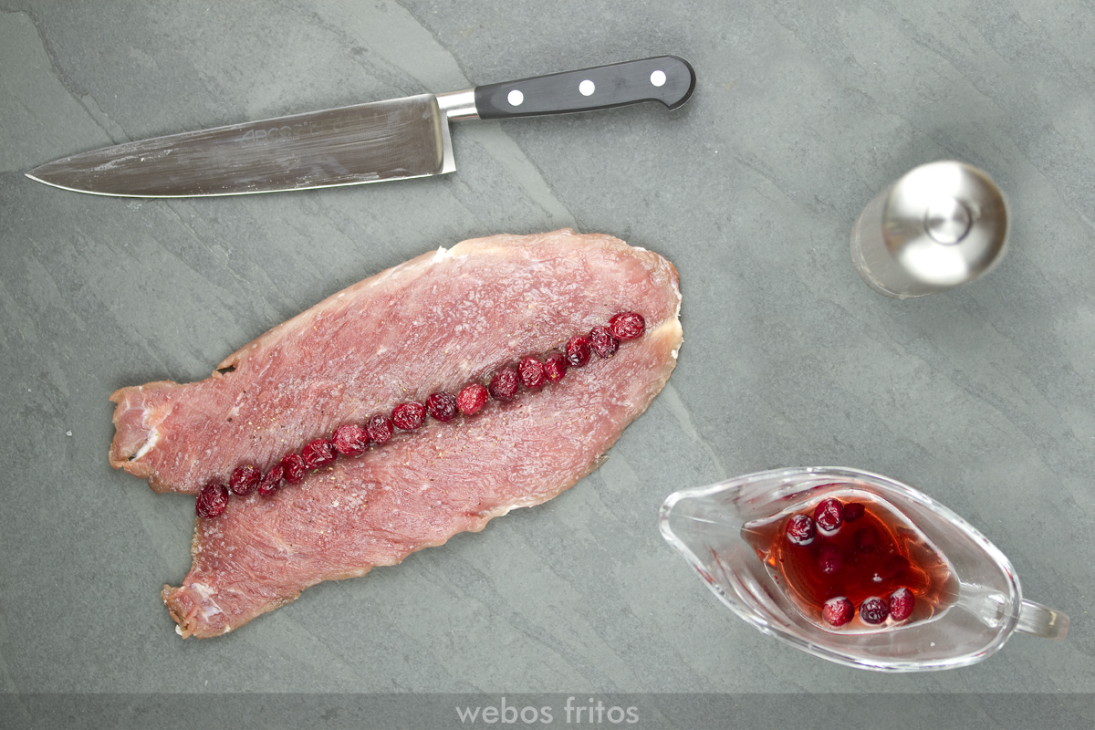 • Dejar el solomillo limpio de la piel fina que lo recubre, abrirlo por la mitad, salpimentar y poner los arándanos en el centro.